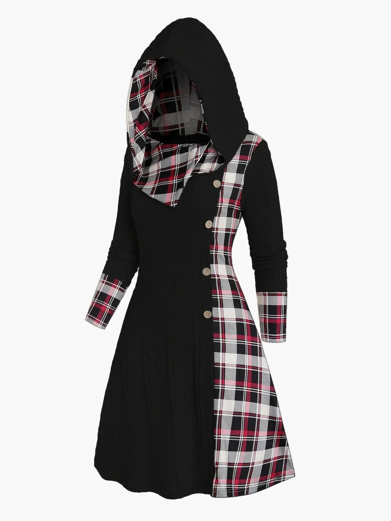 Dieses Damen Kapuzenkleid kombiniert den angesagten Strick-Look mit modernen Karodetails und sorgt so für einen auffälligen und stilvollen Auftritt. Die große Kapuze mit karierter Innenseite bietet nicht nur Schutz vor Wind und Wetter, sondern setzt auch modische Akzente. Der asymmetrische Schnitt mit Knopfleiste und das kontrastierende Karomuster an Ärmel, Rock und Kapuze machen dieses Kleid zu einem echten Hingucker.